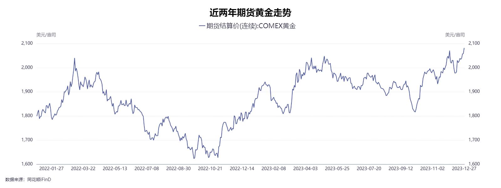 12月,市场提前消化美联储2024年降息预期。12月4日期货黄金创历史新高,达到2152.3美元/盎司。短暂回调后,美联储议息会议召开,黄金再起涨势,站稳2000美元/盎司。2023年国际期货黄金涨约12%