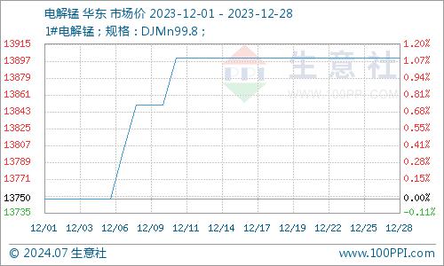 2023年12月1#电解锰市场先涨后稳,整体上行,华东地区现货市场价格月初在13750元/吨,月末在13900元/吨,月涨1.09%。
