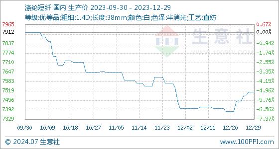 12月29日,生意社涤纶短纤基准价为7512.00元/吨,与本月初(7402.00元/吨)相比,上涨了1.49%。