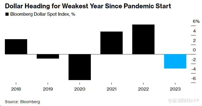 由于华尔街押注美联储将在安全控制住物价后降息,美元将遭遇疫情暴发以来表现最糟糕的一年。Bloomberg美元指数自1月份以来下跌了近3%,这是自2020年以来的最大年度跌幅。