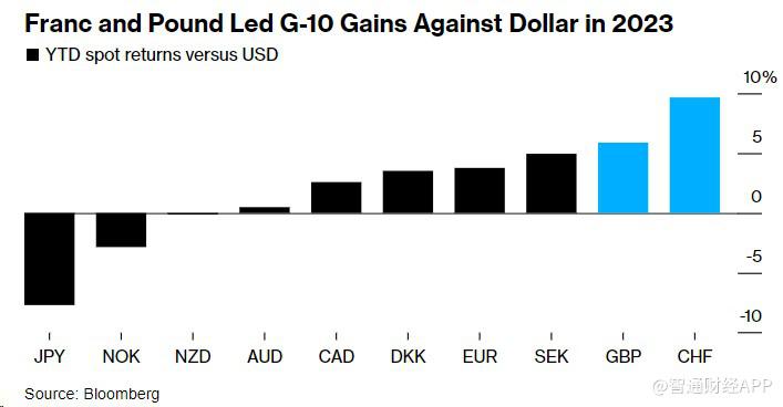 2023年瑞郎和英镑兑美元汇率领涨10国集团货币