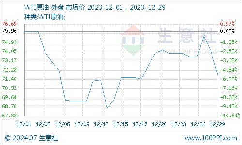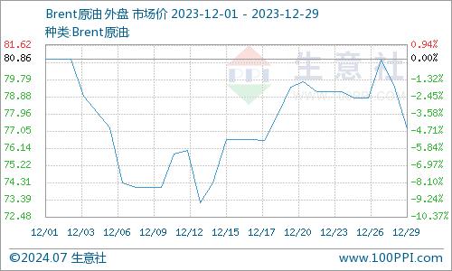 原油价格:12月28日国际原油期货重挫逾3%。美国WTI原油期货主力合约结算价报71.77美元/桶,跌幅为2.34美元或3.2%。布伦特原油期货主力合约结算价报77.15美元/桶,跌幅2.39美元或3.0%。红海航运陆续恢复,地缘风险缓解,油价承压。生意社原油分析师认为,目前油价持续回升主要受地缘紧张局势扰动。中长期来看,供需博弈仍是交易的主要逻辑:供应面,OPEC+深化减产,美国产量增加预期会表现的此消彼长。需求端,美元贬值和美联储降息预期会对油价带来提振。总的来看,油价短期受地缘局势影响会继续探寻向上的空间,中长期供需会加剧油市宽幅震荡
