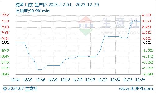 据生意社商品行情分析系统,本月纯苯月初价格小幅下跌,中旬之后价格一直在上涨。12月1日价格在6692元/吨;12月29日价格在7230元/吨,较月初上涨8.03%,较去年同期上涨10.68%。