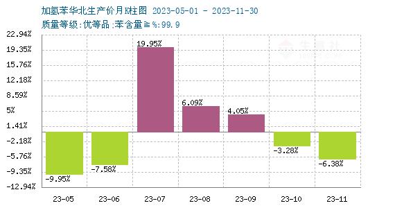 商品价格K柱图,运用价格走势K线的理念,以柱状图形式,反映每周或者每月的价格涨跌变化,投资者可以根据K柱图的变化,来进行买卖投资。红色表示:上涨;绿色表示:下跌;K柱高度表示:涨跌幅度。进入23年后加氢苯市场涨多跌少,进入5月后市场连续2月下行,7、8月连续两月上涨。周度K柱图显示,加氢苯市场进入10月后波动较小,涨跌参半。