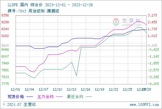 据生意社商品行情分析系统监测,LLDPE(7042)12月1日国内价格在8100元/吨,12月29日均价在8230元/吨,期间报价上涨1.6%。