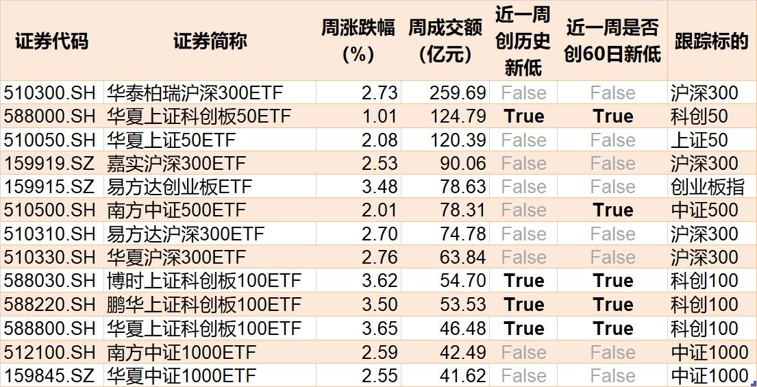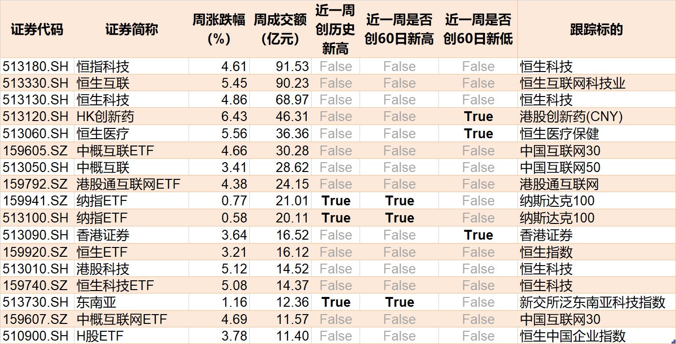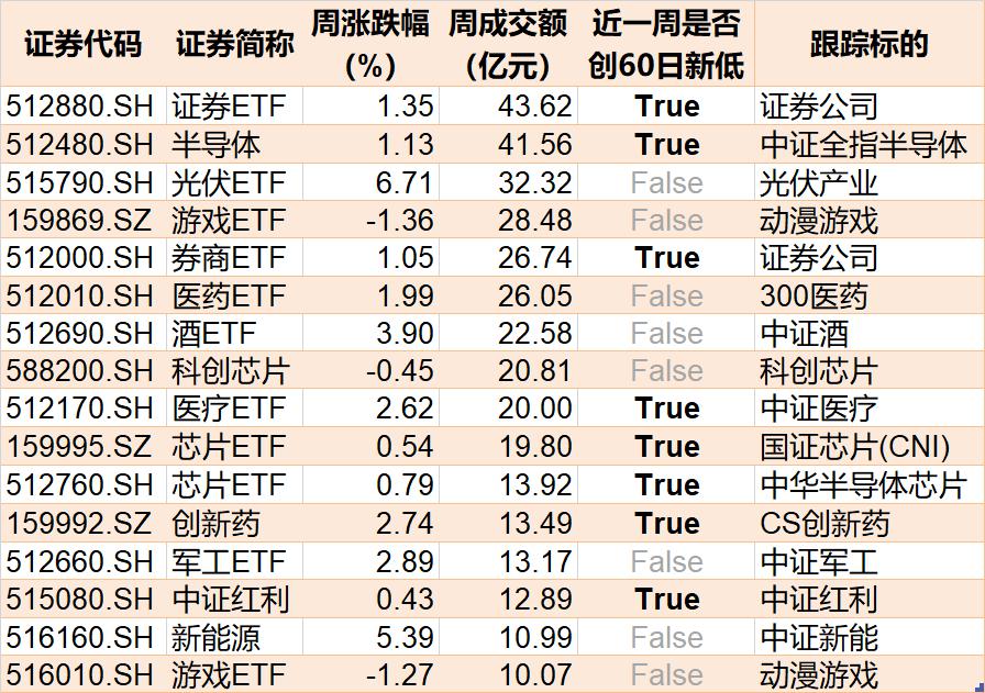 成交额靠前的有跟踪证券公司的证券ETF、跟踪中证全指半导体的半导体ETF,周成交额均超40亿元。