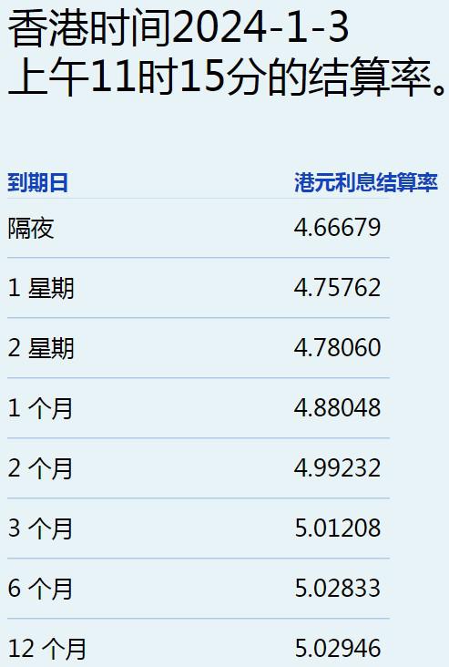 1月3日,港元拆息继昨日全线下跌后,今日两周及以下拆息全线回升,其中,隔夜息反弹26基点至4.66679%,但与楼按相关的一个月拆息连跌五天,再跌10基点至4.88048%,为11月7日以来最低。两个月拆息跌至4.99232%,失守5%,六个月及一年期拆息则险守5%,分别报5.02833%和5.02946%。