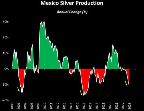根据Vince Lanci的说法,墨西哥也在对其剩余的白银进行软国有化。金砖国家现在越来越多地限制七国集团获得其剩余资源。墨西哥的情况尤其糟糕。作为世界领先的白银生产国,墨西哥在过去10年的平均年产量为5600吨。不幸的是,到2020年,其资源储量减少到仅3.7万吨。如果采矿继续以目前的速度进行,该国的储量将在2026年底耗尽。