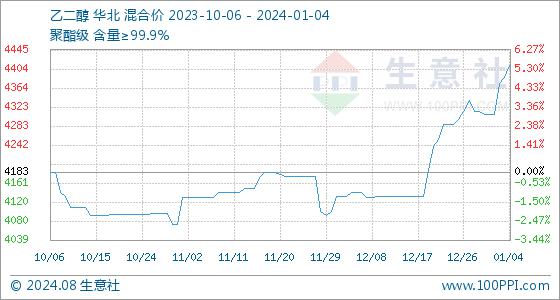 1月4日,生意社乙二醇基准价为4386.67元/吨,与本月初(4307.50元/吨)相比,上涨了1.84%。