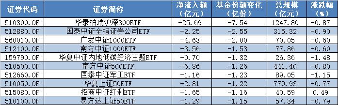 此外,华泰柏瑞沪深300ETF的基金份额下降了7.54亿份,对应的净流出额为25.69亿元。