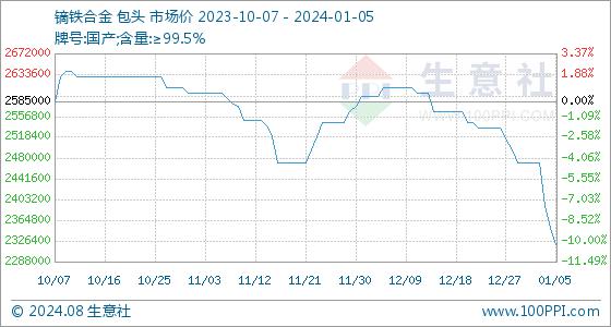 1月5日,生意社镝铁合金基准价为2350000.00元/吨,与本月初(2470000.00元/吨)相比,下降了-4.86%。