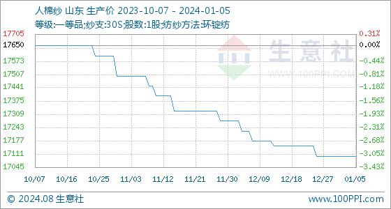 1月5日,生意社人棉纱基准价为17100.00元/吨,与本月初持平。