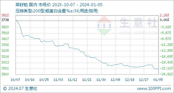 1月5日,生意社菜籽粕基准价为2913.33元/吨,与本月初(2971.67元/吨)相比,下降了-1.96%。