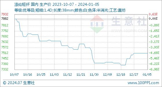 1月5日,生意社涤纶短纤基准价为7512.00元/吨,与本月初持平。