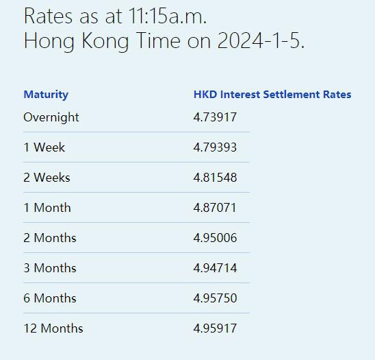 1月5日,港元拆息普遍走低,隔夜息结束两连升,下跌18基点至4.73917%,与楼按相关的一个月拆息亦回落至4.87071%,创近两个月新低,三个月期跌至4.94714%,续创逾三个半月新低。