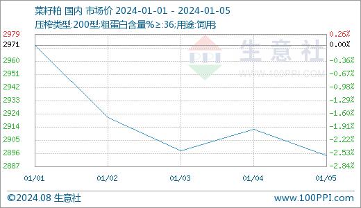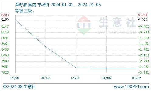 据生意社商品行情分析系统监测:1月1日菜籽油现货市场均价8180元/吨,1月5日菜籽油现货市场均价7948元/吨,期间报价幅度下跌2.83%。1月1日菜粕市场均价为2971元/吨,1月5日菜粕市场均价为2895元/吨,期间下跌幅度在2.58%。