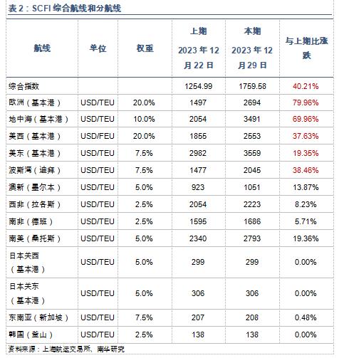 第三,风险外溢。全球集装箱班轮运输网络可谓相互联系、相互影响。作为全球两大运河之一的苏伊士运河因红海事件通行受限,而当这种受限持续时,就会影响到除欧地航线以外的航线。从最新公布的SCFI来看,不止欧线和地中海航线的运价出现大涨,美西、美东和波斯湾航线的环比涨幅也都在15%以上。