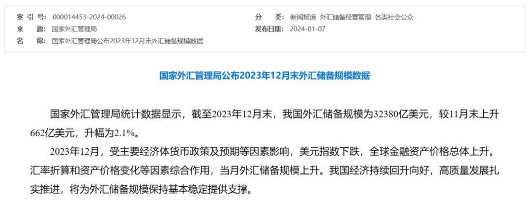 1月7日,国家外汇管理局公布2023年12月末外汇储备规模数据,截至2023年12月末,我国外汇储备规模为32380亿美元,较11月末上升662亿美元,升幅为2.1%。