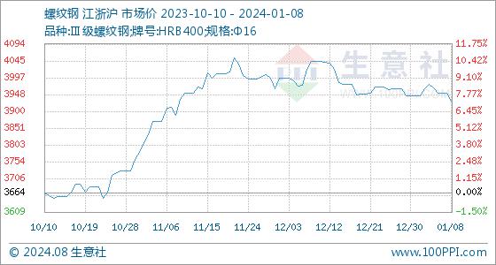 1月8日生意社螺纹钢基准价为3952.89元/吨