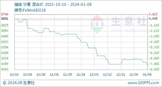 1月8日,生意社锰硅基准价为6180.00元/吨,与本月初(6215.00元/吨)相比,下降了-0.56%。