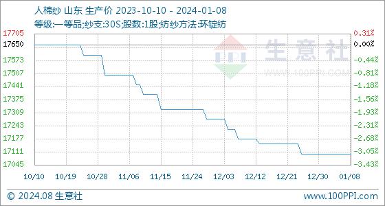 1月8日,生意社人棉纱基准价为17100.00元/吨,与本月初持平。