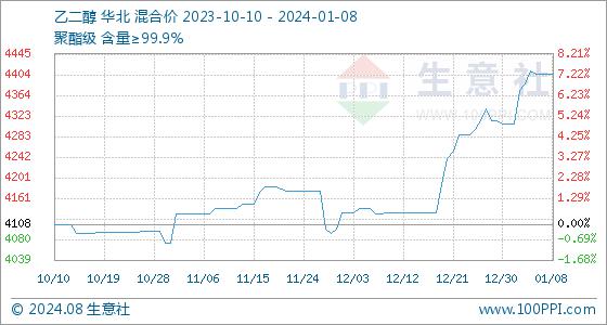 1月8日,生意社乙二醇基准价为4406.67元/吨,与本月初(4307.50元/吨)相比,上涨了2.30%。