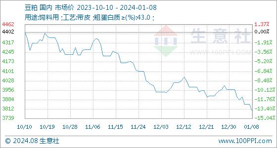 1月8日,生意社豆粕基准价为3848.00元/吨,与本月初(3962.00元/吨)相比,下降了-2.88%。