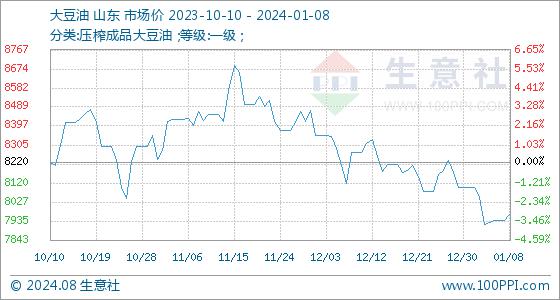 1月8日,生意社大豆油基准价为7940.00元/吨,与本月初(8096.00元/吨)相比,下降了-1.93%。