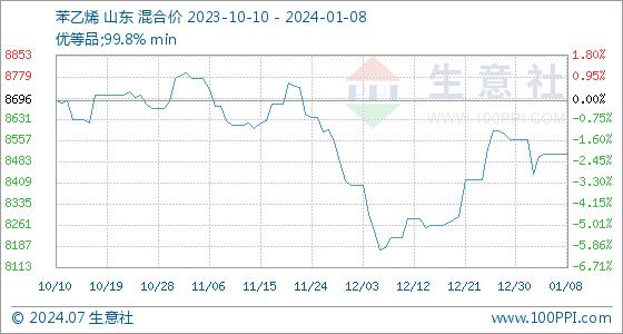 1月8日,生意社苯乙烯基准价为8510.00元/吨,与本月初(8560.00元/吨)相比,下降了-0.58%。