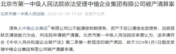 据北京市第一中级人民法院1月5日消息,债务人中植企业集团有限公司以不能清偿到期债务,资产不足以清偿全部债务,且明显缺乏清偿能力为由,向法院申请破产清算。北京市第一中级人民法院经审查认为,该申请符合《中华人民共和国企业破产法》第二条第一款规定的破产原因,故于2024年1月5日裁定受理中植企业集团有限公司破产清算申请。