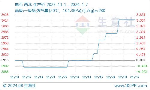 据生意社商品行情分析系统,本周西北地区电石出厂价格暂稳。本周西北电石主流生产厂家出厂均价为3016.67元/吨,周末价格同比下跌18.83%。1月7日电石商品指数为79.04,与昨日持平,较周期内最高点212.23点(2021-10-26)下降了62.76%,较2016年03月14日最低点55.49点上涨了42.44%。(注:周期指2011-09-01至今)