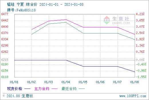 据生意社商品行情分析系统,硅锰宁夏地区(规格为FeMN68Si18)1月5日市场报价在6100-6200元/吨附近,市场均价6180元/吨,跌0.56%。本周硅锰市场依旧弱势运行,元旦节后归来,整体盘面呈现偏弱态势,基本面仍然偏弱,叠加钢厂冬储不及预期,硅锰盘面跟随黑色系下跌。