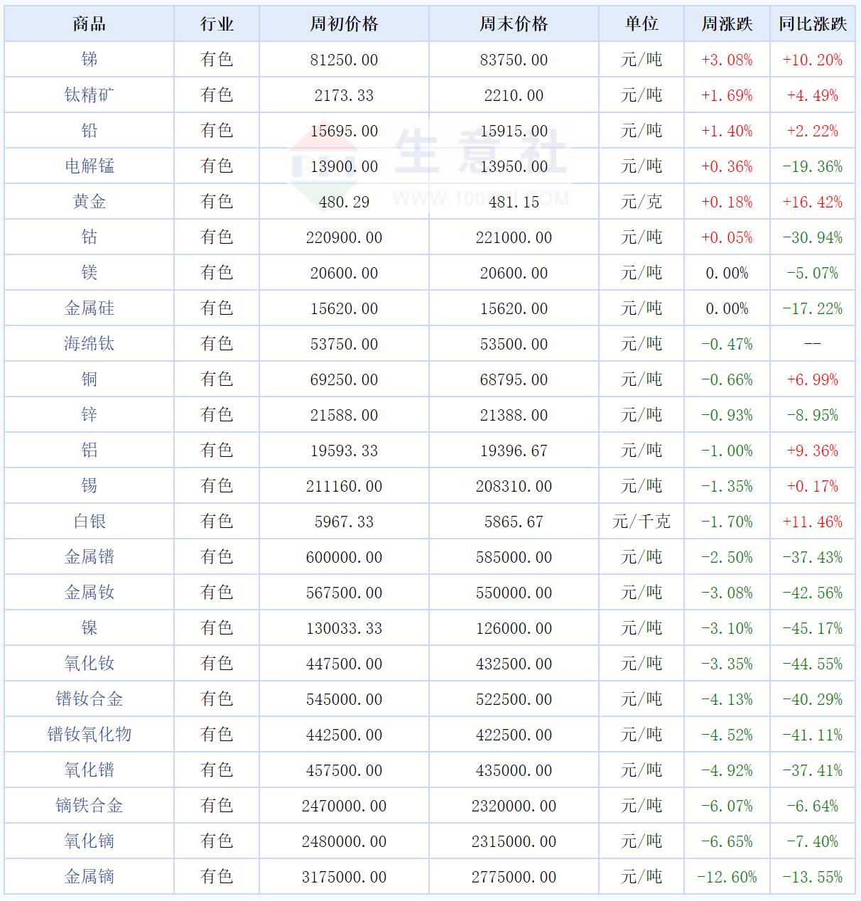 据生意社价格监测,2024年第01周(1.1-1.5)大宗商品价格涨跌榜中有色板块环比上升的商品共6种,涨幅前3的商品分别为锑(3.08%)、钛精矿(1.69%)、铅(1.40%)。环比下降的商品共有16种,跌幅在5%以上的商品共3种,占该板块被监测商品数的12.5%;跌幅前3的产品分别为金属镝(-12.60%)、氧化镝(-6.65%)、镝铁合金(-6.07%)。本周均涨跌幅为-2.1%。