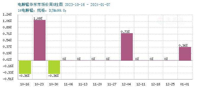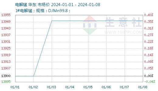 据生意社商品行情分析系统:本周(1月1日至1月8日)1#电解锰市场小幅上涨,华东地区市场价格1月8日价格在14000元/吨,涨0.36%。