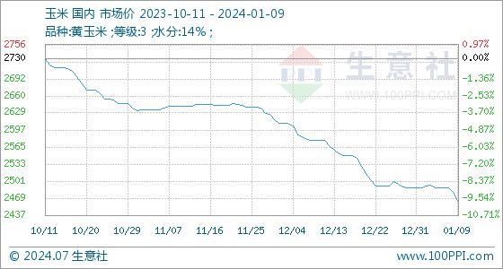 1月9日,生意社玉米基准价为2480.00元/吨,与本月初(2488.57元/吨)相比,下降了-0.34%。