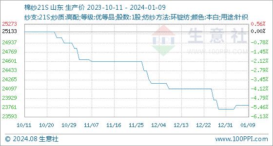 1月9日,生意社棉纱21S基准价为23800.00元/吨,与本月初(23733.33元/吨)相比,上涨了0.28%。