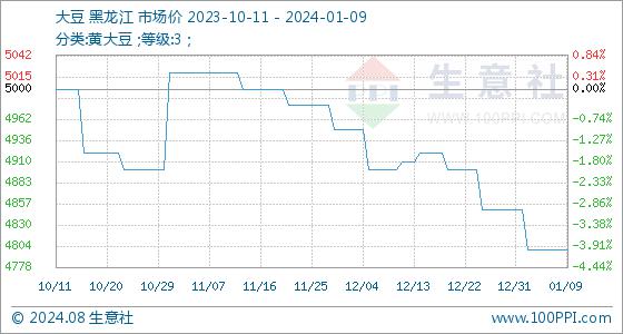 1月9日,生意社大豆基准价为4800.00元/吨,与本月初(4850.00元/吨)相比,下降了-1.03%。