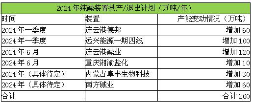 从供应方面看,国家统计局数据显示,2023年1-11月纯碱累计产量2957.5万吨,同比增长9.5%,全年预计产量在3240万吨左右,较2022年增幅11%左右。2024年产量按照计划预期将达到3600万吨以上,增幅在350万吨以上。一是远兴能源一期3条线和金山五期将全部达成,4线将推迟到2024年点火投料。连云港碱业120万吨预期将于2024年下半年投产。综合预计2024年新增产能有限,但是新增产量将较大。