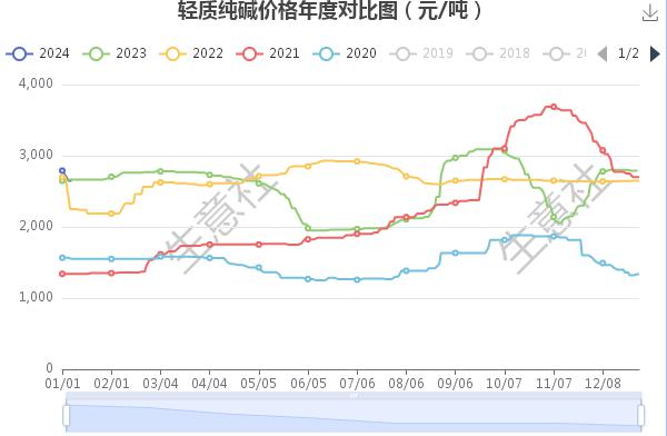 看一下纯碱价格对比图:从2018年到2023年生意社年度价格对比图可以看出,2023年纯碱价格处于5年来较低价格水平,那么2024年纯碱能否再创2021年的价格高位?