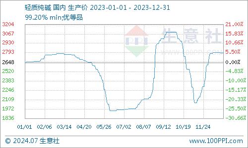 据生意社商品分析系统显示,2023年纯碱价格整体呈“W”型。年初纯碱市场均价为2648元/吨,年末纯碱价格2790元/吨,价格上涨5.36%。