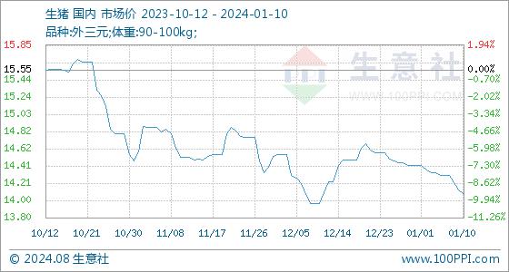 1月10日,生意社生猪基准价为14.13元/公斤,与本月初(14.42元/公斤)相比,下降了-2.01%。