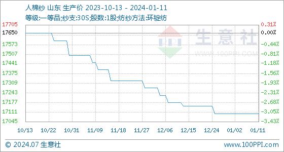 1月11日,生意社人棉纱基准价为17100.00元/吨,与本月初持平。