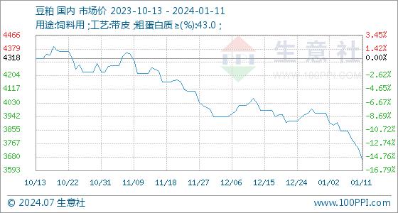 1月11日,生意社豆粕基准价为3734.00元/吨,与本月初(3962.00元/吨)相比,下降了-5.75%。