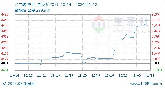 1月12日,生意社乙二醇基准价为4458.33元/吨,与本月初(4307.50元/吨)相比,上涨了3.50%。