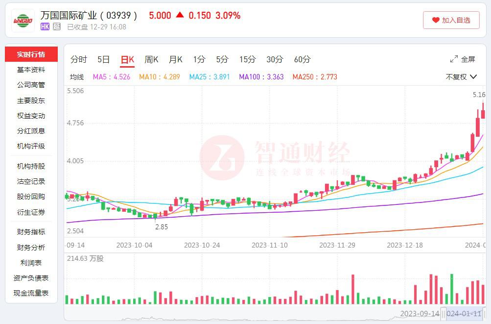 在港股市场一众金属概念股中,万国国际矿业并不算“起眼”。该公司于2012年登陆港股市场,上市以来其股价一直在5港元水平线徘徊,最低迷时股价曾不到1.2港元。近期以来,受铜价上涨消息利好,其股价也终于算是冲破了5港元这一“关口”。