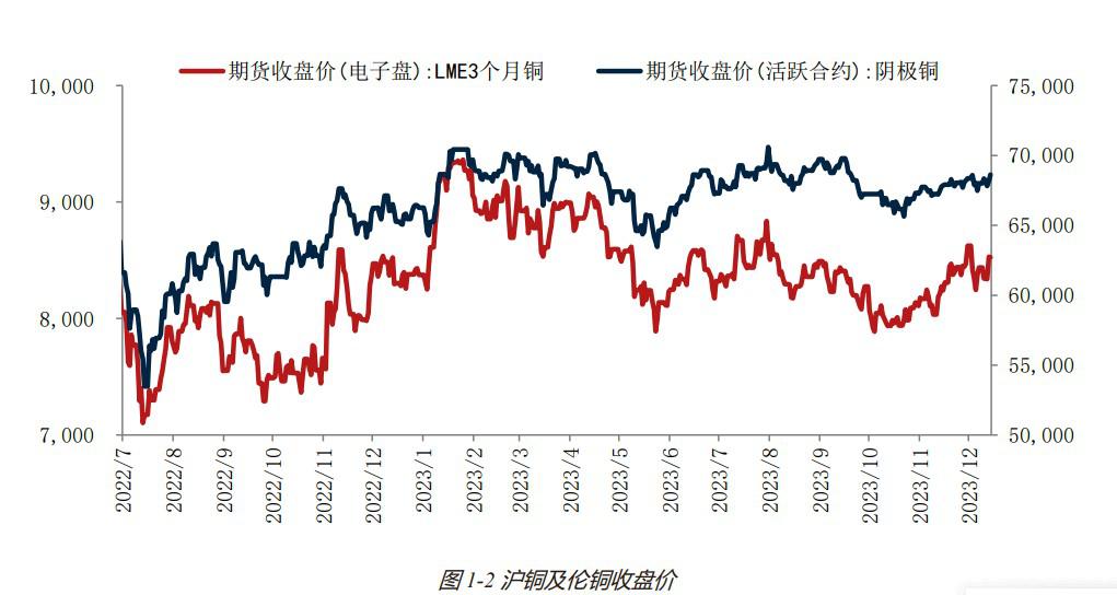 2023年,受劳资纠纷、环保抗议和需求波动等多重因素影响,铜价历经起伏——具体来看,截至12月18日,沪铜主力在年内累计涨幅3.61%,期间在一月份触及年内高点71500元/吨,最低在五月下探至年内低位62690元/吨附近;国际铜主力年内累计上涨3.14%至61070元/吨。LME铜三个月合约年内累计上涨1.86%至8530美元/吨附近。