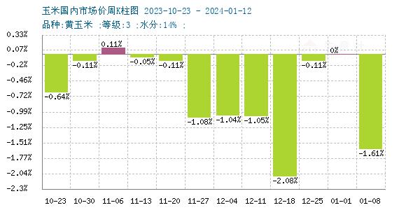 据生意社商品行情分析系统,本周国内玉米价格持续弱势下行,周初3等黄玉米均价为2480.00元/吨,周末均价为2440.00元/吨,周内下跌1.61%。