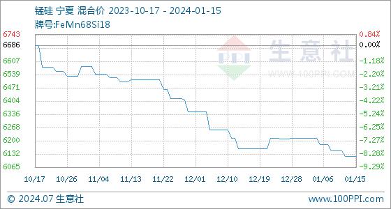 1月15日,生意社锰硅基准价为6121.67元/吨,与本月初(6215.00元/吨)相比,下降了-1.50%。