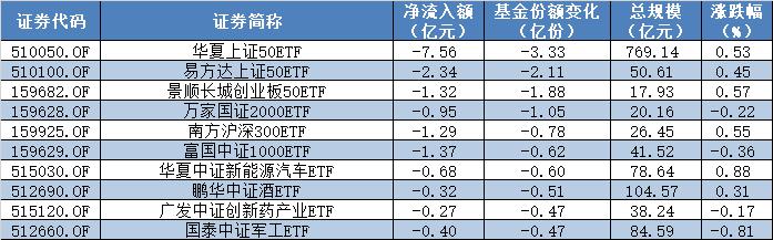 此外,华夏上证50ETF的基金份额下降了3.33亿份,对应的净流出额为7.56亿元,为当日净流出最多的产品。