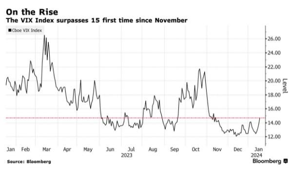 截至周三收盘,VIX指数已从去年12月中旬11.81的四年低点回升,突显出美股在去年最后几个月出现爆炸性上涨后,在2024年的开局并不顺利。标普500指数本月迄今下跌约0.7%,去年12月,该指数曾大涨4.4%。标普500指数周三收跌0.56%,报4739.21点。数周以来,标普500指数一直徘徊在2022年初以来的纪录附近,但一直未能突破这一水平。